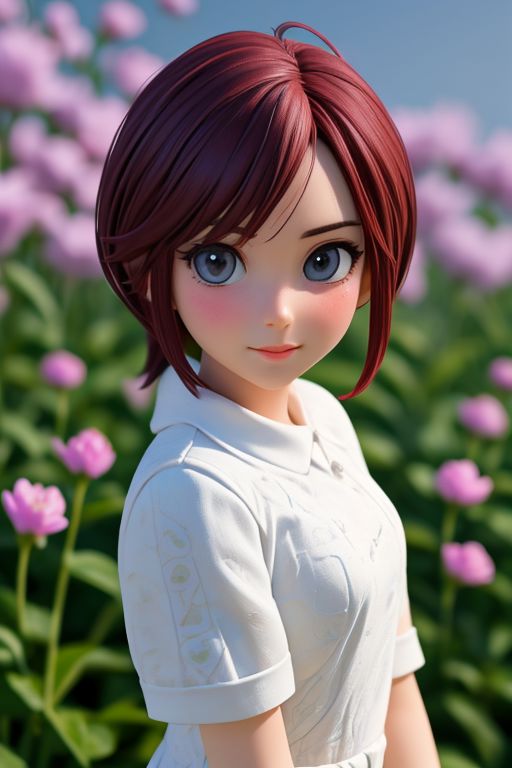 medium shot, beautiful 18yo female, casual spring flower-patterned-dress, chiseled face, blushing, dimples, solo, skinny, spring flower garden, vivid colors, optimal-lighting, pov face, (3d, pixar)(detailed, highres, best-quality)