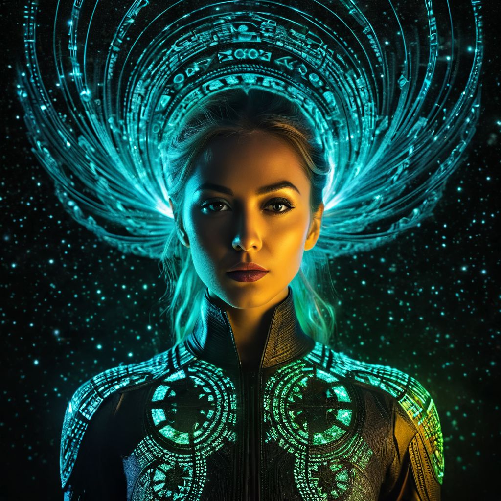 a beautiful 20 year old girl, milky way double long-exposure looks like fractal geometry, traffic light,runes, arcane, quantic, astral, surreal, ethereal glow, photorealistic, perfect composition, masterpiece, best quality,intricate design, hyper realistic, high definition, extremely detailed, dark softbox image, raytracing, cinematic, HDR, photorealistic, stop motion, motion graphics, in the style of constantine and equilibrium,