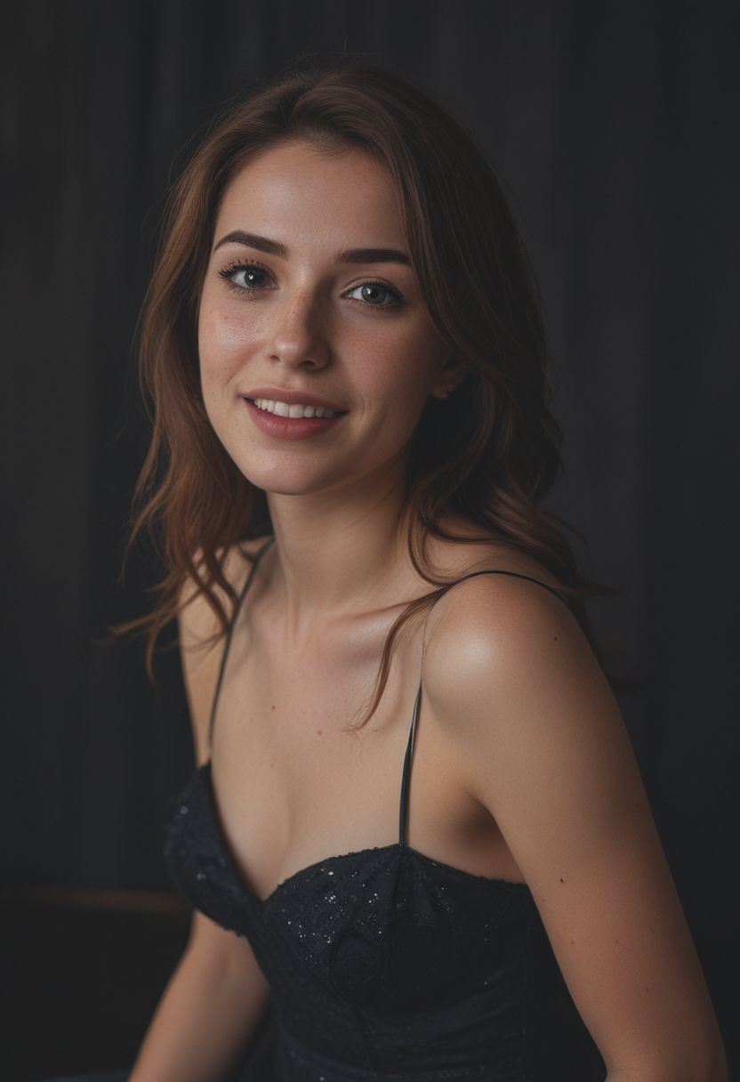 photo of an 21 years old woman, kneeling:1.2, looking up at the camera, taken in a dark room, brown hair, freckles, big eyes with thick eyeliner, smiling, round clear low angled eyes, seductive gaze, soft diffuse light, soft diffuse backlight, shallow focus,(nighttime:1.5), (bokeh effect:1.2),(cinematic face:1.1),(best quality, best image:1.5),(film grain:1.1),(film photography, dramatic shadows), (eye highlight catchlight:1.3),(perfect composition)