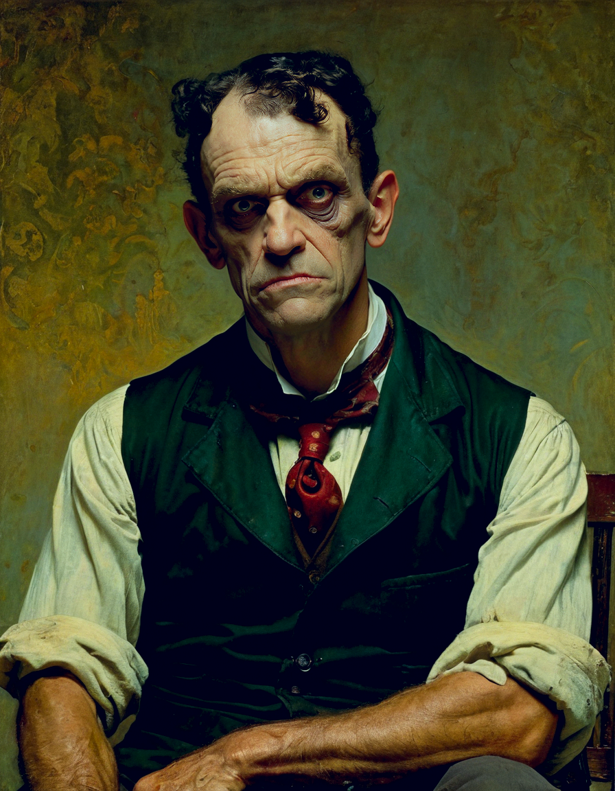 upper body shot of eerie grumpy Dr. Victor Frankenstein, (by Norman Rockwell, (Frank Frazetta:1.15):1.05), (Alphonse Mucha:0.15),{creepy|gloomy|natural|bright|cheerful|idyllic}, {harsh|diffuse} {direct|indirect} lit from {above|right|left|below|behind|front}, steempunk
