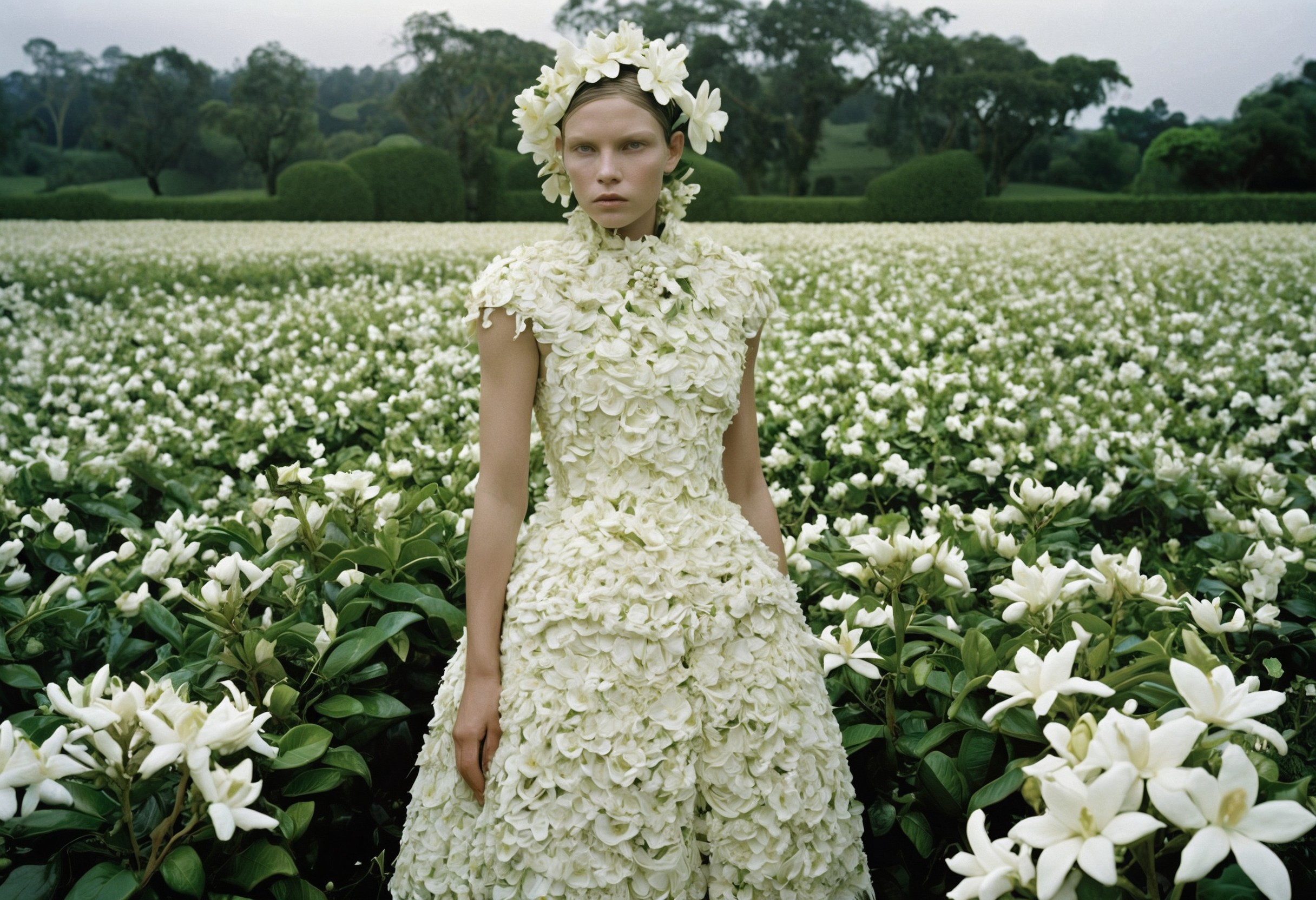 planted with smooth pattern clothing Jasmine and gardenia flower in a scene of where the wild things are gardenia field : portrait photography by tim walker , surreal