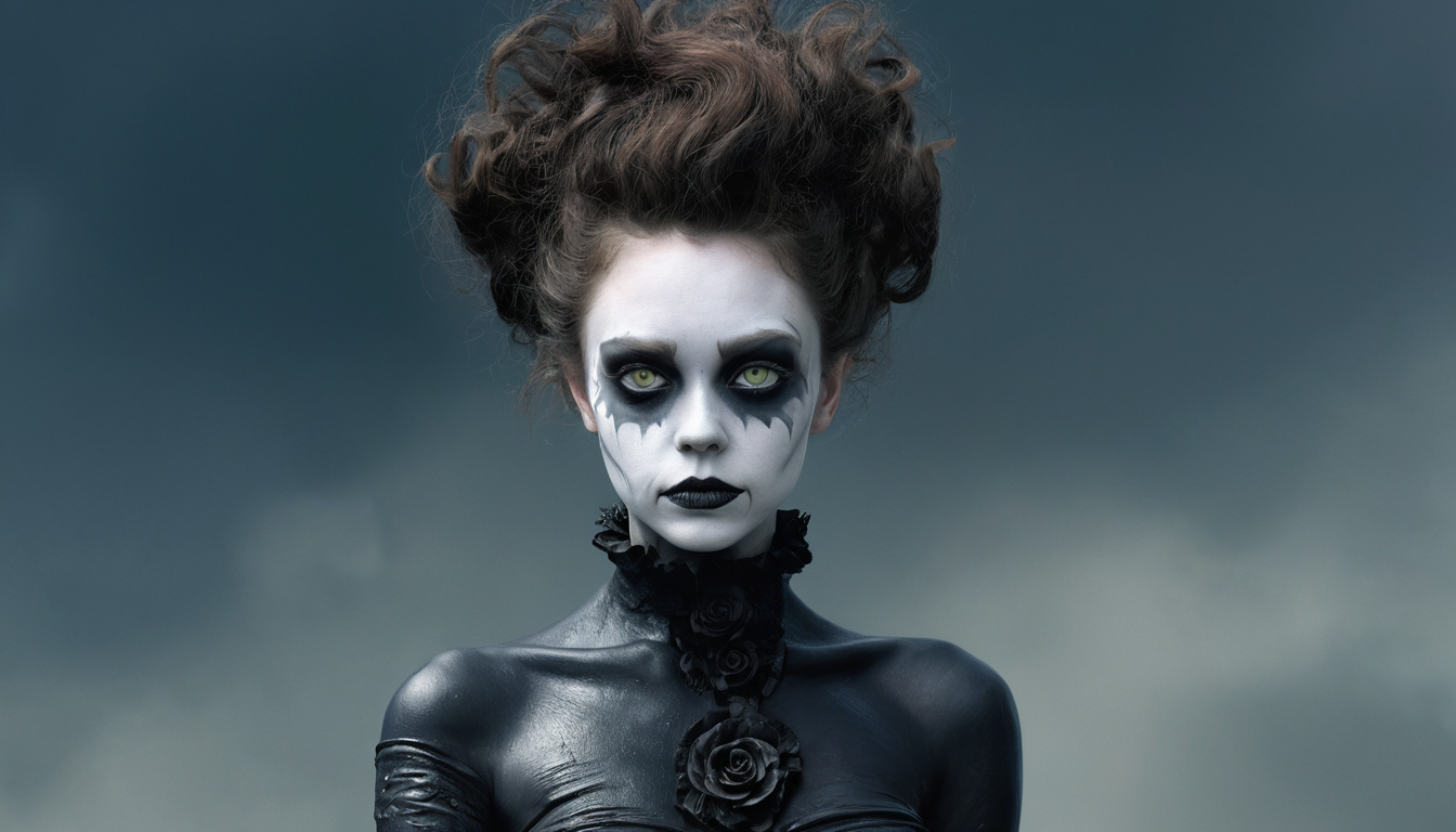 concept art, full body photo of a 18yo girl, heavy make up, well-litt, , model face, by tim burton, digital artwork, illustrative, painterly, matte painting, highly detailed