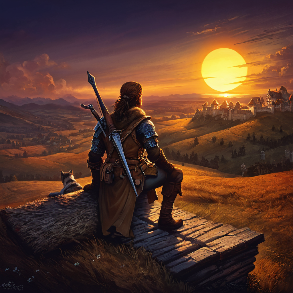 medieval hunter resting looking at the sunset, from behind, fantasy, rpg, rpgartworkstyle, artwork, detailed, <lora:RpgArtworkStyle_v1:0.9>