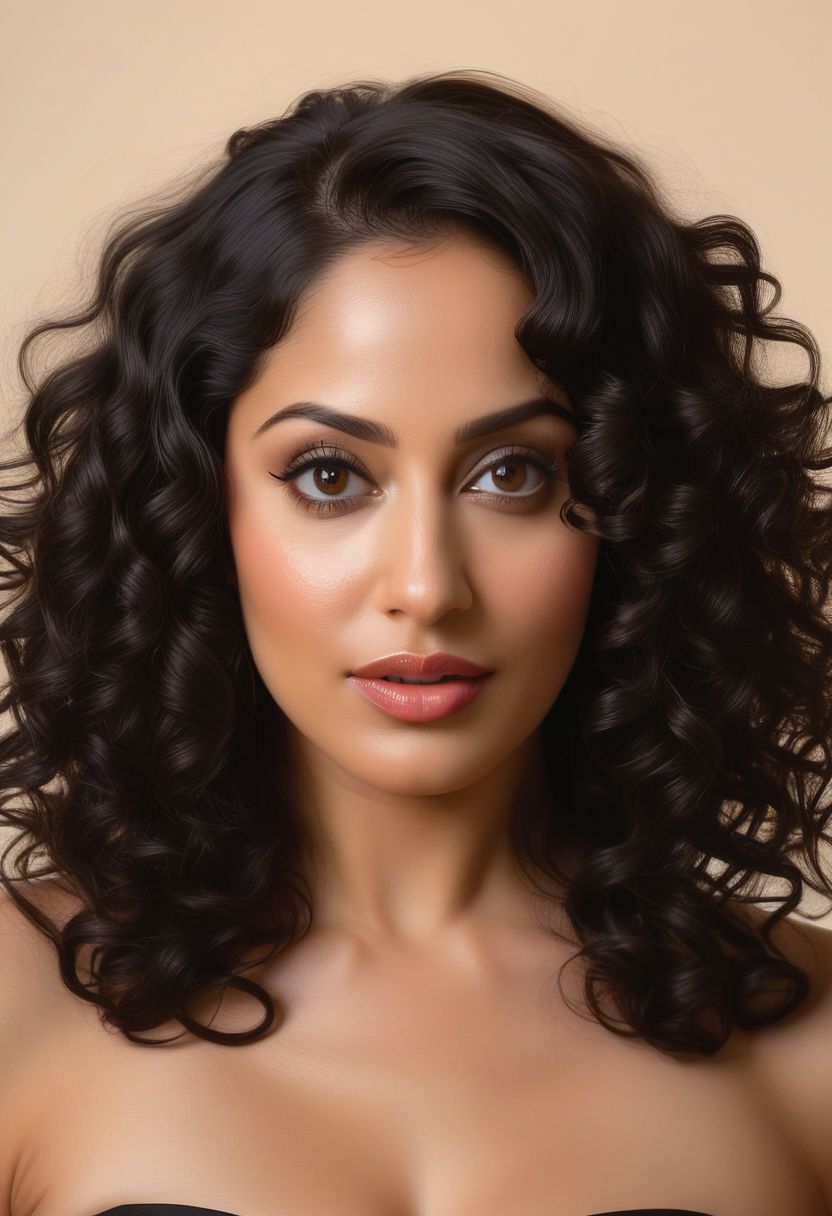 medium angle eye level painting of Puja Banerjee, medium beige skin tone, black curly medium length hair, (curly hair:1.7), black eyes, straight nose, real human, realistic, realistic skin, (skin pores:1.2), craig Mallism, artgerm, jeremy lipkin and michael garmash, Artgerm, perfect eyes, (brushstrokes:0.7), minimal simple background,portrait photo