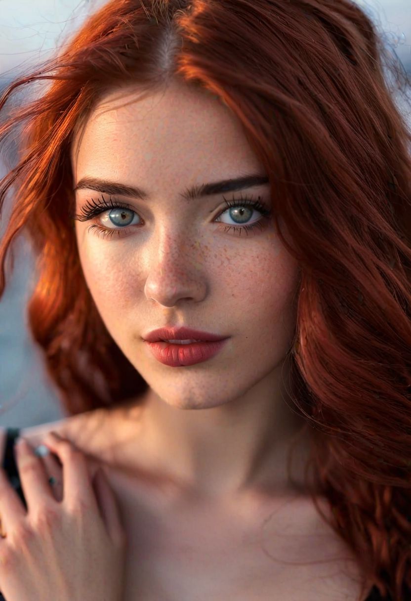 Beautiful sexy shy girl 18yo with long messy red hair, puffy pout lips and intricate details on her skin, tack sharp focus on eyes, freckles, backlighting (((masterpiece))) professional photo, 8k, arms behind head, exposed small breasts