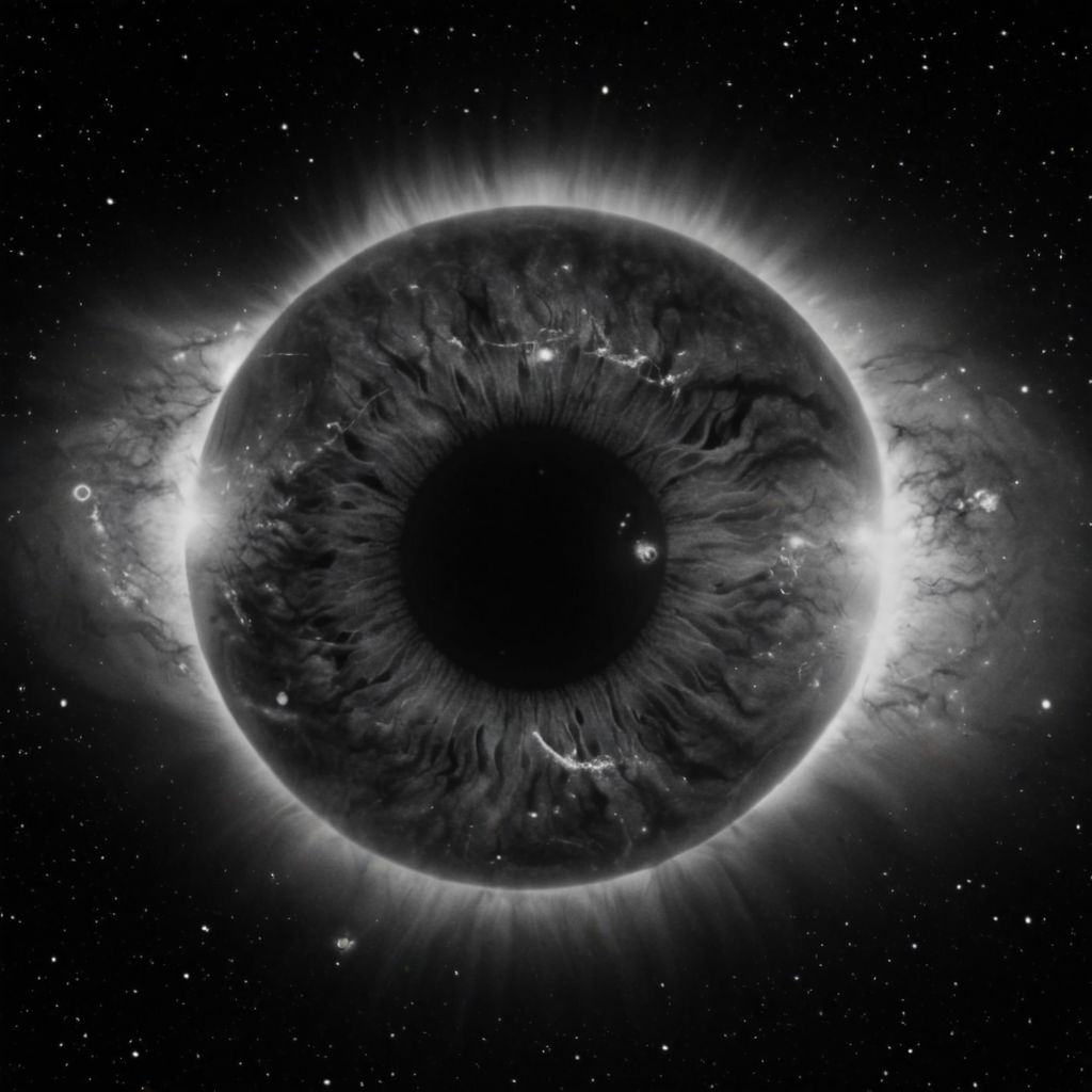 cinematic, (((black and white, monochrome, greyscale))), portrait of a mysterious, bioluminescent, eye, the beauty of the galaxy are shown through this eye, supernovas and pulsars erupt, 4k, high quality, grain, grainy, noise, detailed, contrast, heavy dynamic shadows, atmospheric,