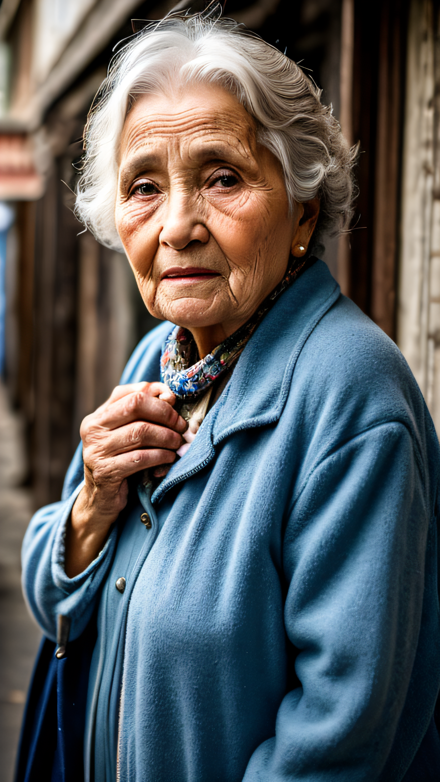 old lady in old clothes, ragged clothes, sad face, sad expression, standing in a crowded street, detailed background, highly detailed face, extremely detailed, high quality, best quality, looking at viewer, whole body, full body in frame