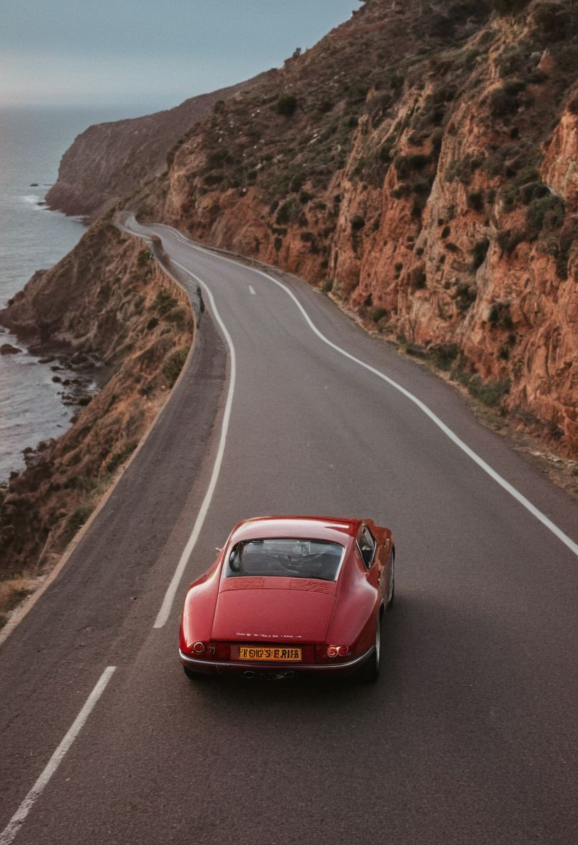 bright red porsche sports car with dark tinted windows, high gloss, cliffside road, sunset, city with lights in background, pink purple orange haze, wide-angle top-down pov, reflective surfaces, soft focus, 1960's style, cinematic quality, magazine ad.