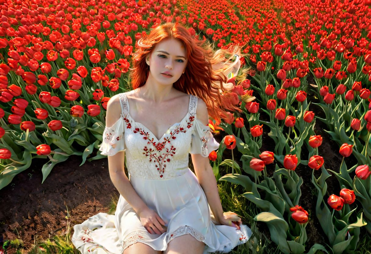 Full body portrait 1woman. (lovely red tulips flower field: 1.9). Red hair, loose hair, windy. White dress with embroided red flowers. Early hour, bright red sun, (Nue artistique, entirement nue: 1.9). Sit on the grass in a garden. Milo Manara's style.photo. SFW