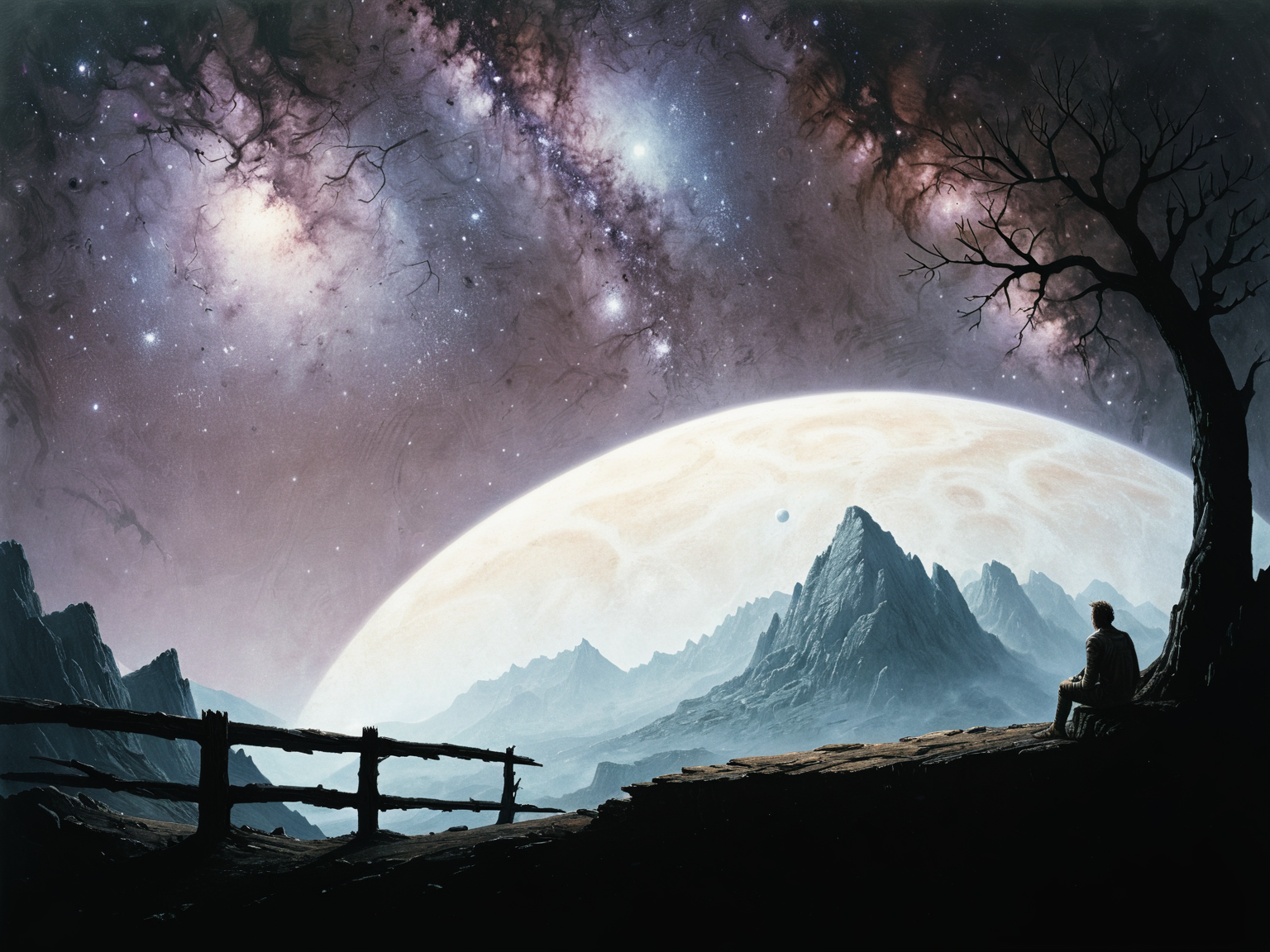 man sitting beside a tree on a desolate planet in deep space, above a mountain valley, brown dwarf giant in horizon, Sci-Fi art, (masterpiece, best quality, highly detailed, realistic), <lora:add_detail:1>, stars in night sky, <lora:The_Dark_Side_of_the_Earth:1> the, with