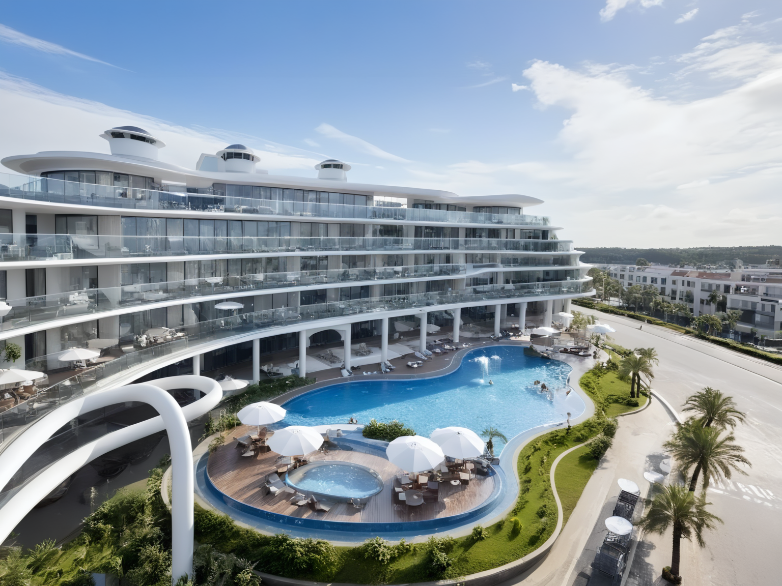 <lora:JJsHotelBuilding_XL:1>,((Hotel Building)) , ((best quality)),((masterpiece)),((realistic)),outdoors,sky,day, cloud, water, spray, no humans, building, scenery, bush, reflection, city, sign, palm tree,cityscape, real world location, road, sidewalk,), glass, ((curvy balcony)),
