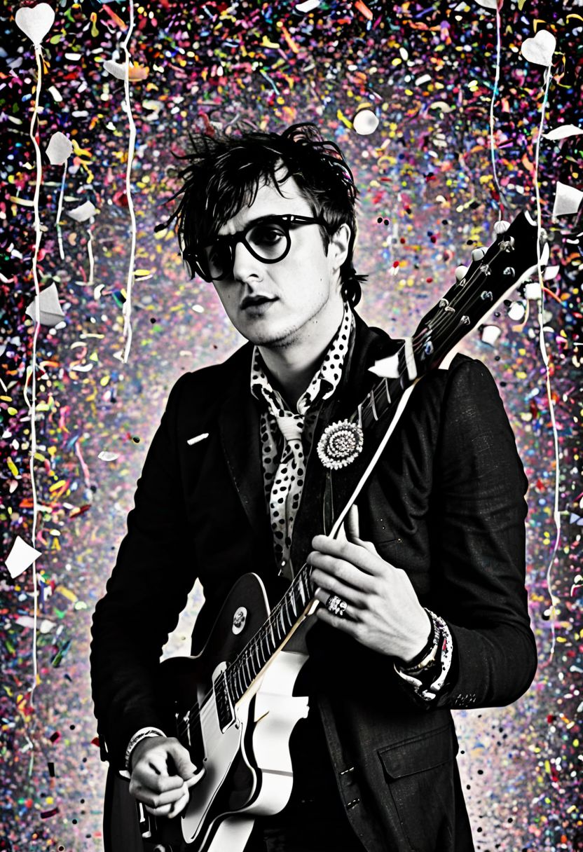 punk rock collage of peter doherty of the libertines, julian Casablancas, indie sleaze, with flowers and confetti falling from above, guitar in his hands and a big polka dot button up shirt, glasses, pompadour, rockabilly, hooligans, United kingdom, England, flag of st peter, (the smiths), post punk, goth, the cure, Robert smith, London, pastiche
