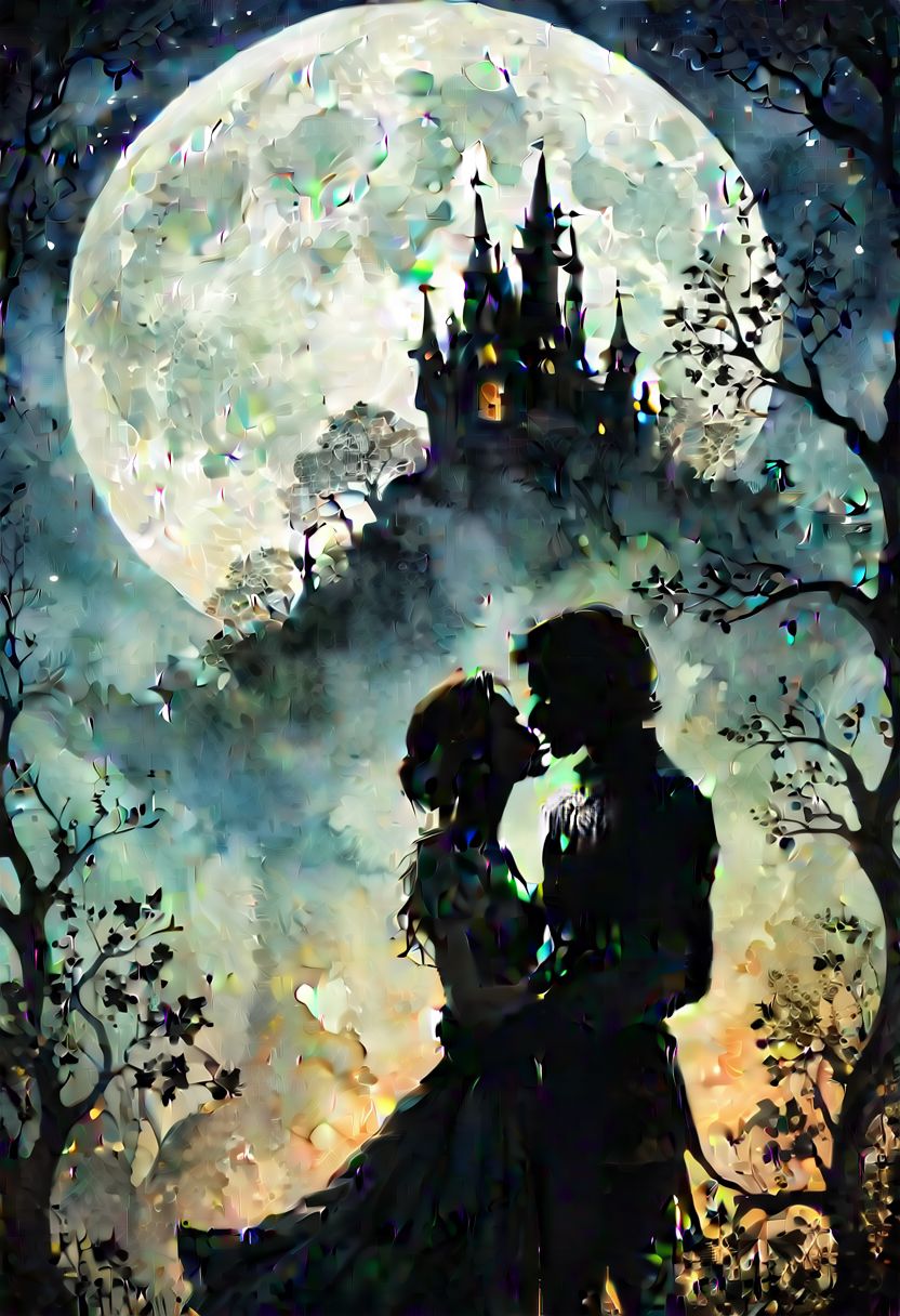 silhouette "a man and a woman":1.4 kissing in front of a full moon, A silhouette of a castle is floating over the upper part of moon. Silhouettes of close up trees and flowers around the canvas. fairytale artwork, watercolor effect, in front of a pale full moon, still from a music video, grasping intricate filigree, or perhaps a fairy tale,realms, featured art, anthropomorphic. Splash effect in the background. masterpiece.
