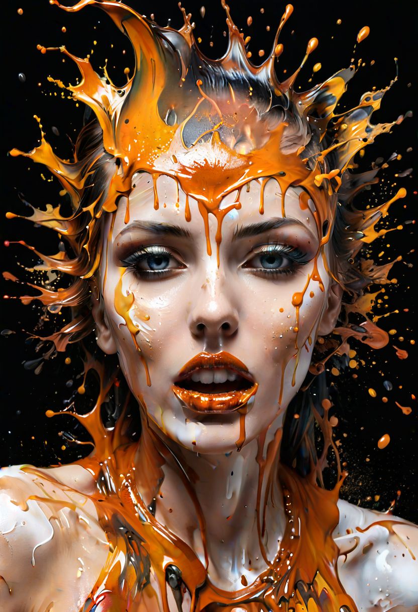 a woman with a big splash of paint all around it's face, Background with more painting splash in an intricate spill that leaves the canvas on a 3D s, masterful digital art, spilling juice, caramel, splash image, adi granov, bioart, strong and ferocious, art photograph, smooth drawing, dew, digital screenshot, artistic rendering.