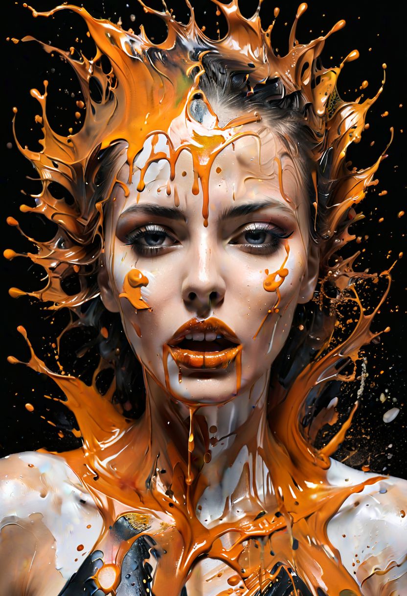 a woman with a big splash of paint all around it's face, Background with more painting splash in an intricate spill that leaves the canvas on a 3D s, masterful digital art, spilling juice, caramel, splash image, adi granov, bioart, strong and ferocious, art photograph, smooth drawing, dew, digital screenshot, artistic rendering.