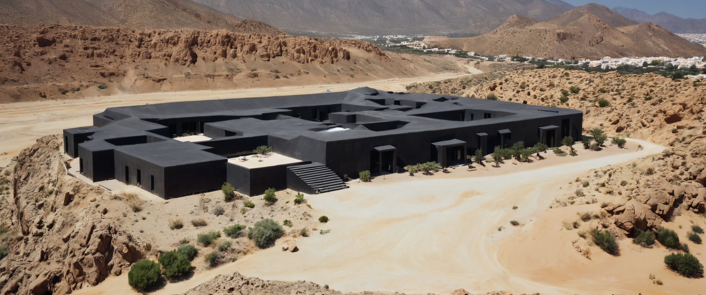 RAW photo, architecture photography, <lora:FormFinder-XL_v2:0.7>, retro-futurist cultural center in Morroco, <lora:add-detail-xl:1.2> by ricardo bofill form inspired by Critical regionalism , (( form inspired by morrocan architecture)), vernacular arabic architecture vegetalized roof, comglomerate of forms, arches, made of complex black timber structure, black wood, black tinted concrete, inspired by biomorphic architecture, cinematic shot, constructed on rocky formations, desert in background, complex rock formation and sand, arid Nikon AF-S 70-200mm f/2.8G ED VR II, long exposure, super realistic, 8k, professional photography <lora:epi_noiseoffset2:5>