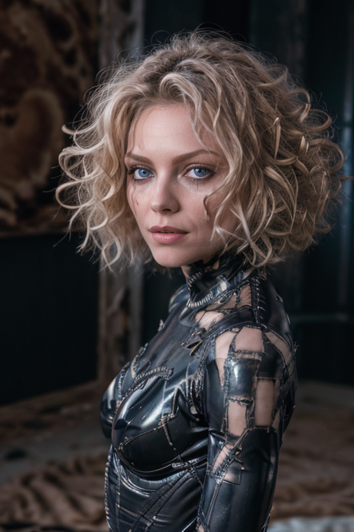 masterpiece, best quality, cinematic, volumetric lighting, very detailed, high resolution, sharp, sharp image, 4k, 8k, 35 mm, <lora:Catwoman1992_MichellePfeiffer_smf_lora_v1-000005:0.9>, 1girl, c4tw0m4n5p-smf, solo, blonde hair, blue eyes, realistic, short hair, lips, looking at viewer, upper body, closed mouth, blurry, bodysuit, ruined hair, ruined makeup, ruined bodysuit <lora:add_detail:0.4>