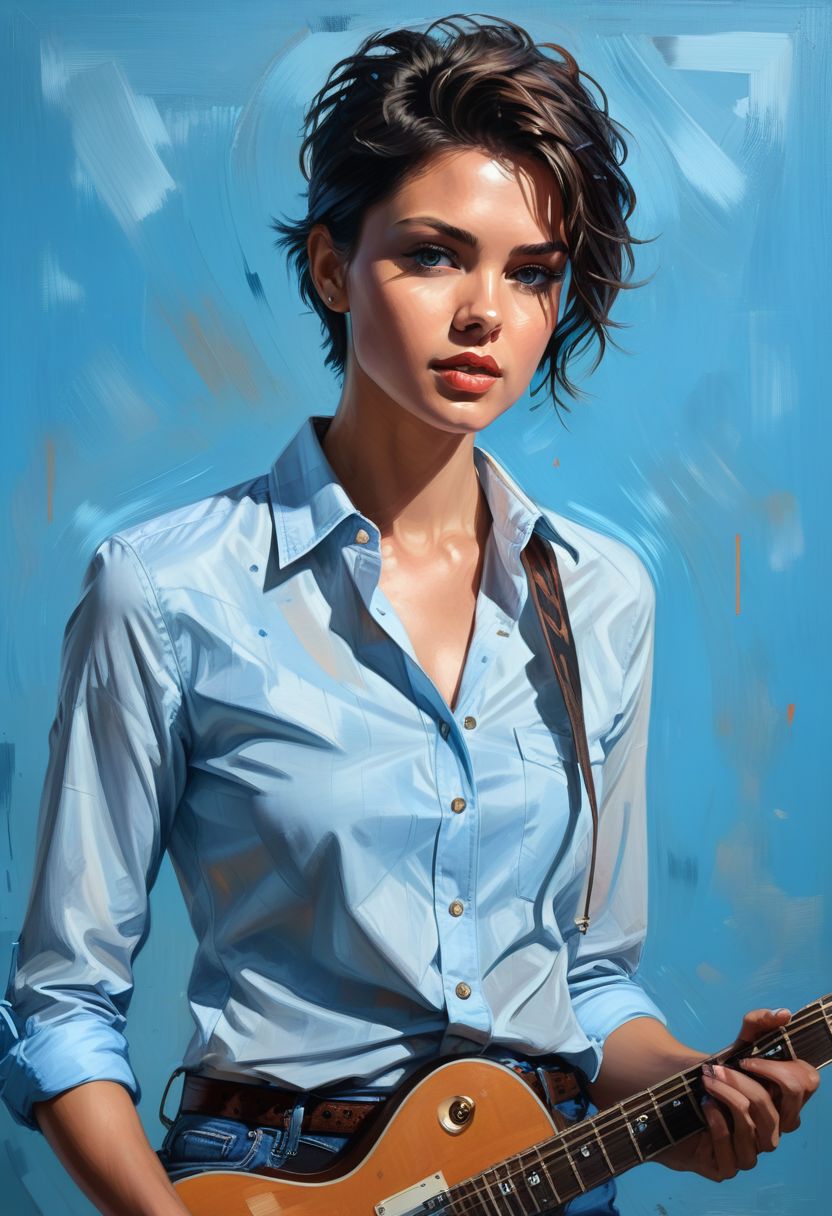 A painting of a woman in a button-up shirt, twink, light brown skin, slim body, short silky hair, messy hair, black hair, light blue eyes, background, a digital painting, by Justin Gerrard, tumblr, Dan Mumford, Tom Bagshaw, 64x64 , on stage, performing, playing guitar, beautiful digital art, beautiful painting, very stylish, Hildebrand