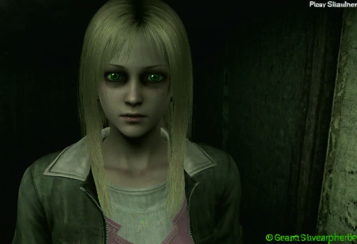 white skin girl, thin, oval face, green eyes, almond eyes, straight nose, blonde hair, long hair, straight hair, horror pink style, 3d model, horror protagonist,female, PS2, PlayStation japan horror, low quality, silent Hill 2, Resident Evil, octane render,detailed, volumetric, dramatic lighting, eerie, dark, spooky, suspenseful, grim, detailed, distressed, edgy, rock and roll vibe, dark, mysterious, haunting, dramatic, ornate, PlayStation 2 graphics, PlayStation 1
