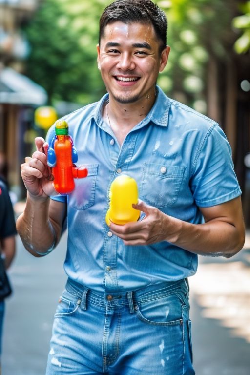 1man, male,asian, Youthful, 25 years old, younger, White and bright skin Radiant and hydrated,((( hand holding water gun))), happy face,((shirt white)), (short jeans, bulge, )VPL, handsome,short hair,pubic hair,muscular,muscle chubby chest, wet, cinematic photo full body, 35mm photograph, film, professional, 4k, highly detailed, RAW photo, subject, 8k uhd, dslr, soft lighting, high quality, film grain, Fujifilm XT3 Thailand city street , daylight