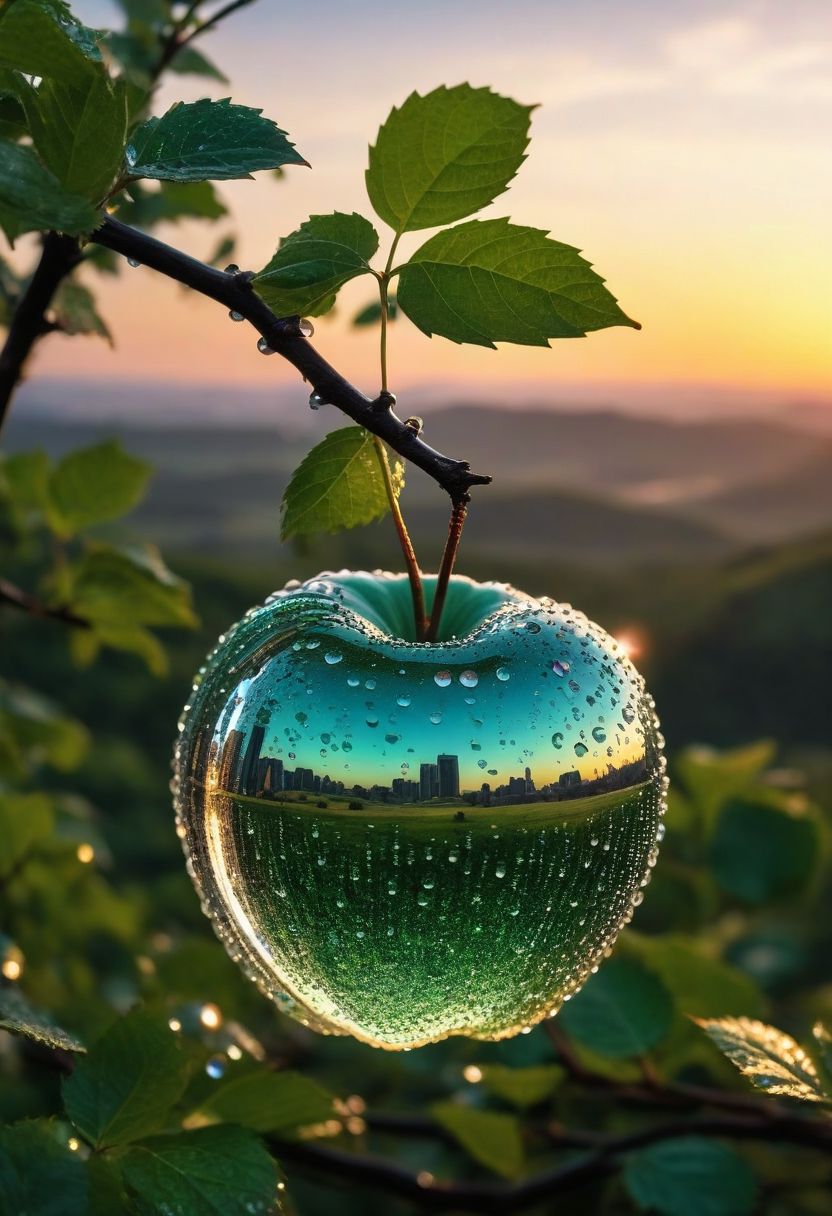 ASCII,masterpiece, hyper detailed, 8k, ray tracing, ultra sharp, ((a delicate big apple) ), made of opale hung on branch in a beautiful dawn, in the background beautiful valleys, (Dew drops) , divine iridescent glowing, opalescent textures, volumetric light, ethereal, sparkling, light inside body, bioluminescence, studio photo, highly detailed, sharp focus, photorealism, 8k, best quality, ultra detail:1. 5, hyper detail, hdr, hyper detail