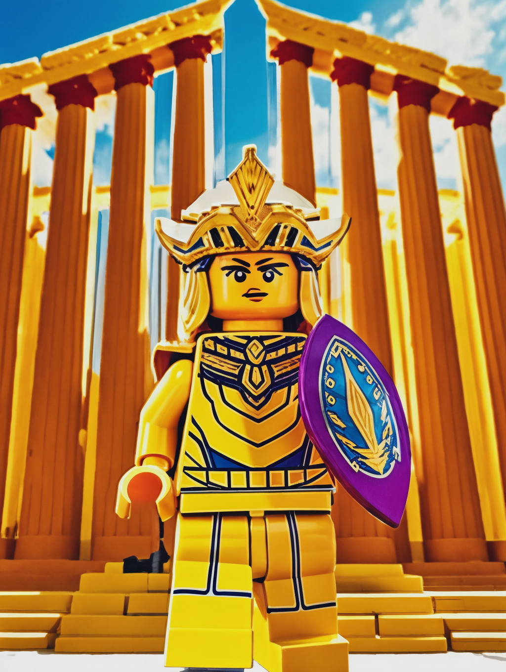 LEGO MiniFig, Saint Seiya in front of the Temple of Athena <lora:lego_v2.0:0.8>, masterpiece, high detail, 8k, high detailed skin, 8k uhd, high quality
