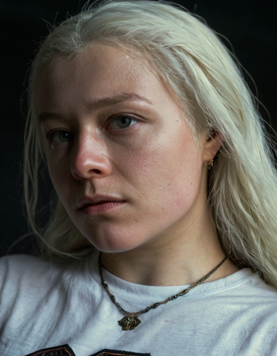 super high resolution intimate photo (extreme close-up) (from below) of rha3nyra looking at camera,she has a long white hair falling behind her back,she is wearing a white t-shirt and taking a selfie,super detailed background,depth of field,(sweaty skin:1.2),volumetric lighting,during daylight,gloomy,(surreal dramatic lighting shadow),natural lighting