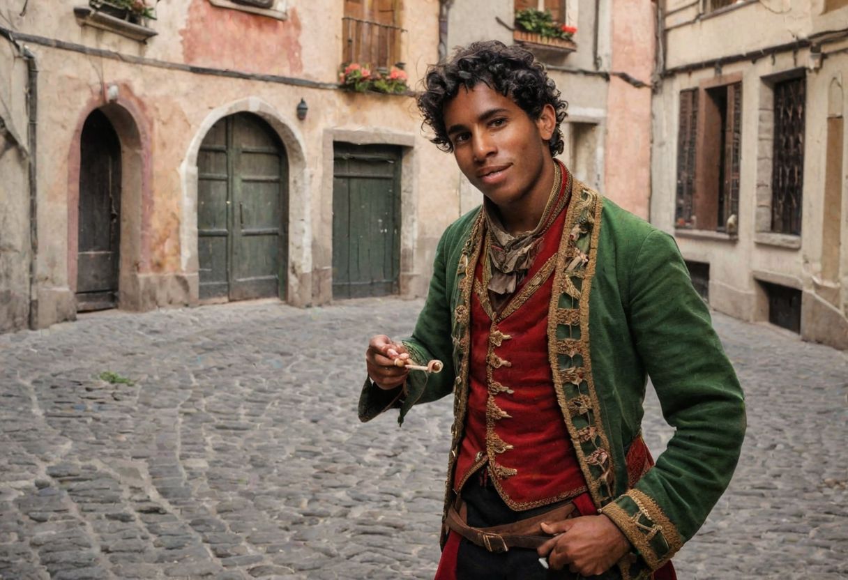 young man, in 1820, his clothing resembles a naar, the color of the clothing includes a combination of green, red, brown, he plays the flute in an old narrow street, rats and children follow him as if they were hypnotized, Pied Piper of Hamel