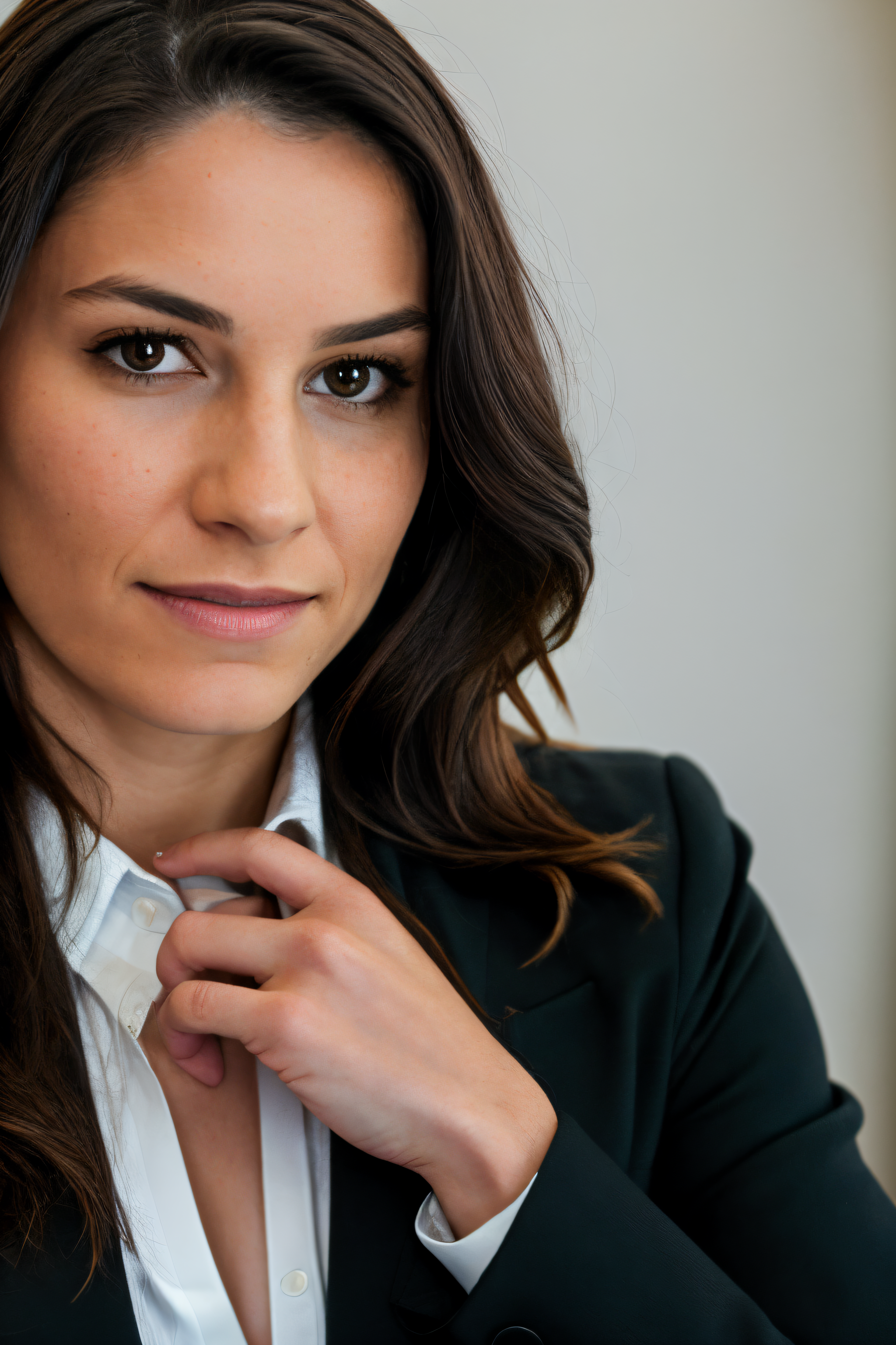 RAW photo of rileemarks, Focused and dedicated in a Blazer and tailored blazer at a high-powered meeting, closeup portrait, (high detailed skin:1.2), 8k uhd, dslr, soft lighting, high quality, film grain, Fujifilm XT3, <lora:rileemarks-000017:1>