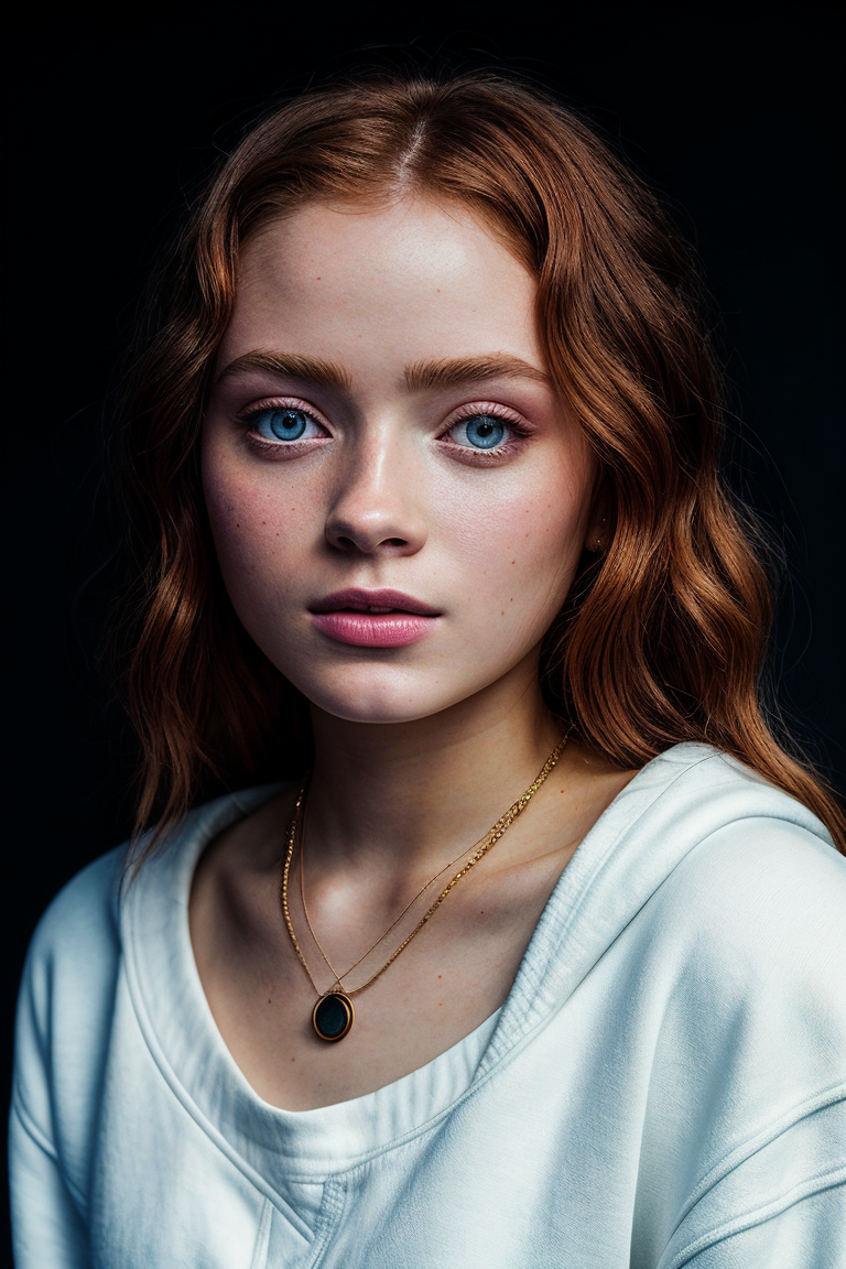 photo of beautiful (s4d1e:0.99), a woman with perfect hair, wearing (80s sweatshirt:1.1), (plain black background:1.1), (necklace), modelshoot style, (extremely detailed CG unity 8k wallpaper), professional majestic photography, (Leica M6 Camera), 24mm, exposure blend, hdr, faded, extremely intricate, High (Detail:1.1), Sharp focus, dramatic, soft cinematic light, (looking at viewer), (detailed pupils), 4k textures, soft cinematic light, adobe lightroom, photolab, elegant, ((((cinematic look)))), soothing tones, insane details, hyperdetailed, low contrast