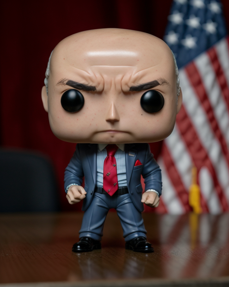 <lora:yomama_pop_toys-10:.75> A professional product shot of ggnsl man yomama_pop_toys bald wearing navy business suit and red tie, , on a desk, studio lit, macro shot <lora:Gensler_ggnsl_60_2-000001:.8> funko pop vinyl figurine