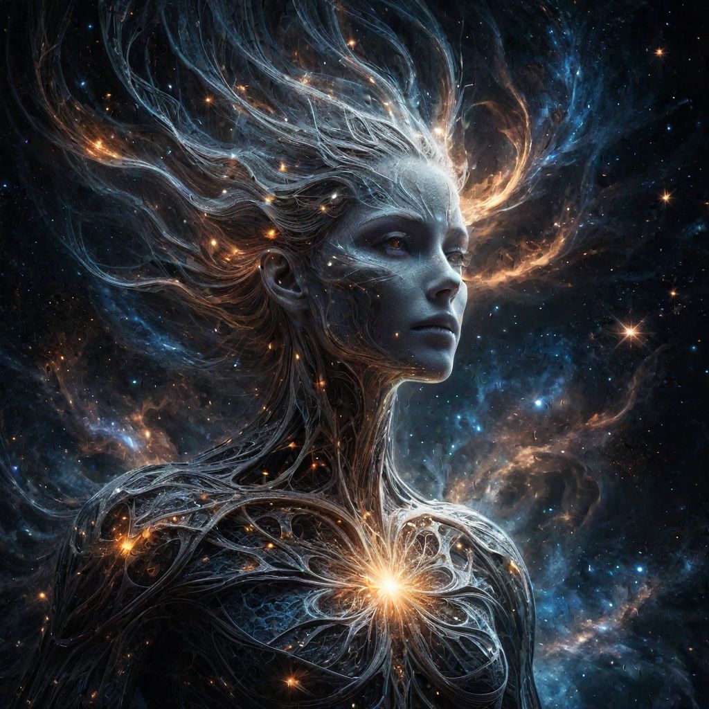 Ethereal being made of mad-wsps, humanoid figure made of light, astral, light shaped into a human form, (flesh made entirely of starlight)+, made of magic, made of galaxies, made of the cosmos, OverallDetail, masterpiece oil painting of photorealistic epic fantasy, fujifilm xt3, 16 uhd, epic quality, ultra-detailed, exquisite features, inspiring, jaw-dropping, cinematic, film grain, intense shadows, moody lighting