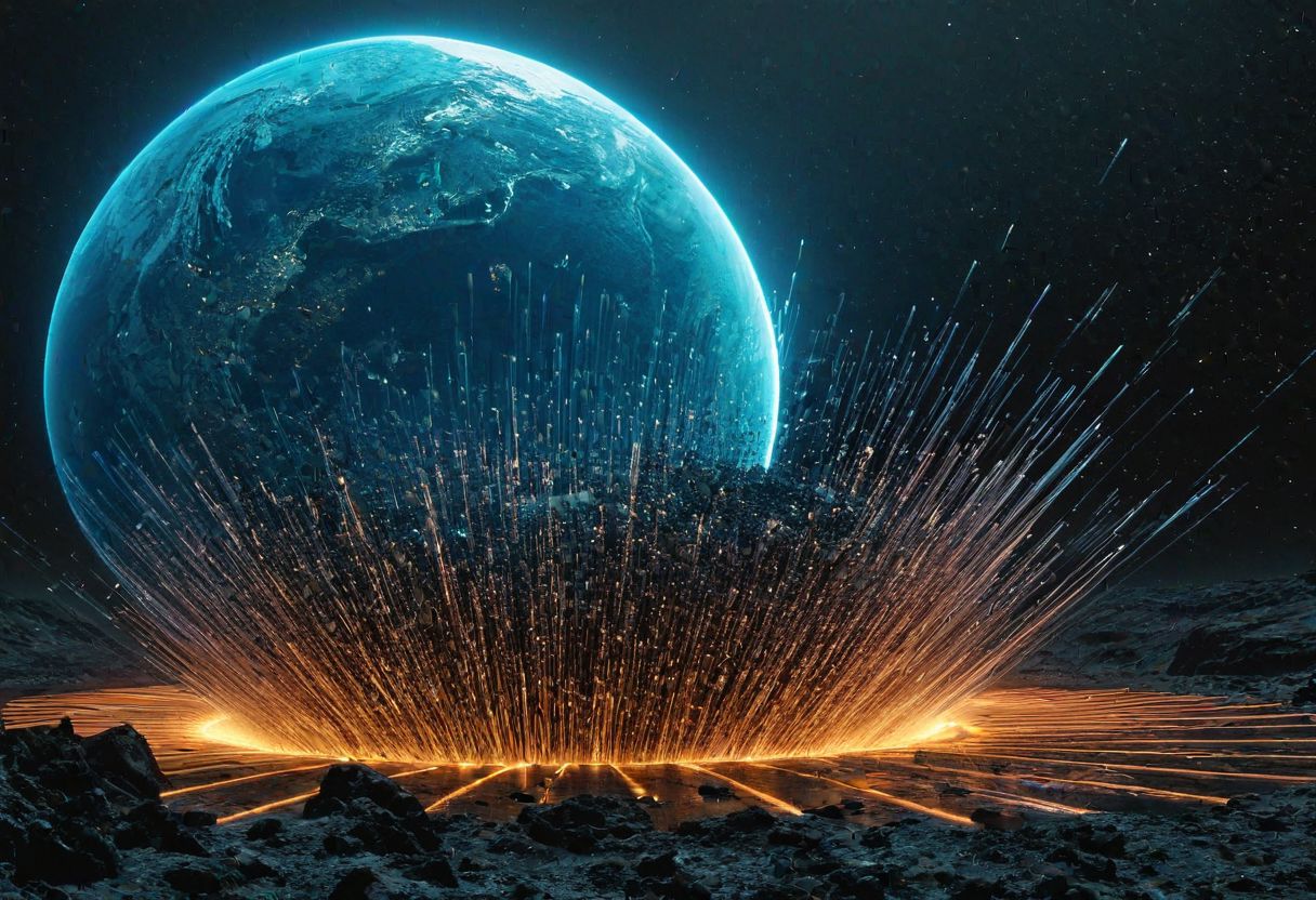 (score_9, result_8_up:1.1), 1angel-like girl ,(masterpiece:1.1), (best quality:1.1), piercing light, (aesthetics:1.1), (low colors:1.2), BREAK, <lora:-_SDXL_-_holo_effect_V1.0:1>, A futuristic epic disaster scene of Earth crashing into another planet made of translucent materials, and its internal structure is clearly visible, including magma spills and light-emitting explosions. its precise construction and possible geostructure. Hi-tech and futuristic holographic planet body scan, bioluminescence, fiber optics, masterpieces, octane rendering, unreal engine, , intricate details, UHDR, 32K,