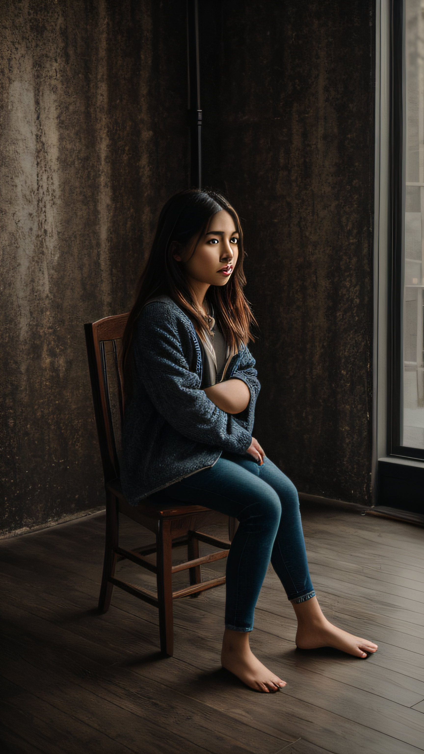 solitude, a person sitting on a chair alone mediating in a dark empty room, dark and mysterious ambience, dressed in normal clothes, detailed background, highly detailed face, extremely detailed, high quality, best quality, looking at viewer, facing camera, whole body, full body in frame