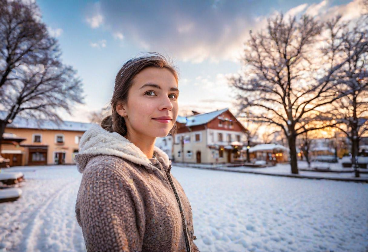 Portrait of a young woman, detailed face, NagykQrs vroshza, small town center, beautiful landscape, calm place, big trees, dawn sky with detailed clouds, snowy mountains background, best quality, photography, warm colours, detailed buildings, award winner photo