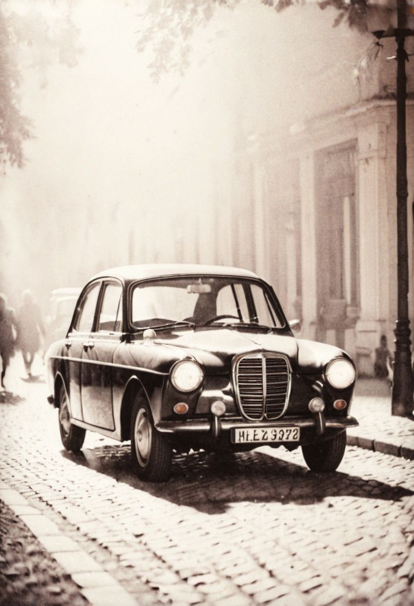 lith_argenta_pressPH1, instagram photo,an old car in a foggy street somewhere in a small european city, dark at night, hard shadows, film grain