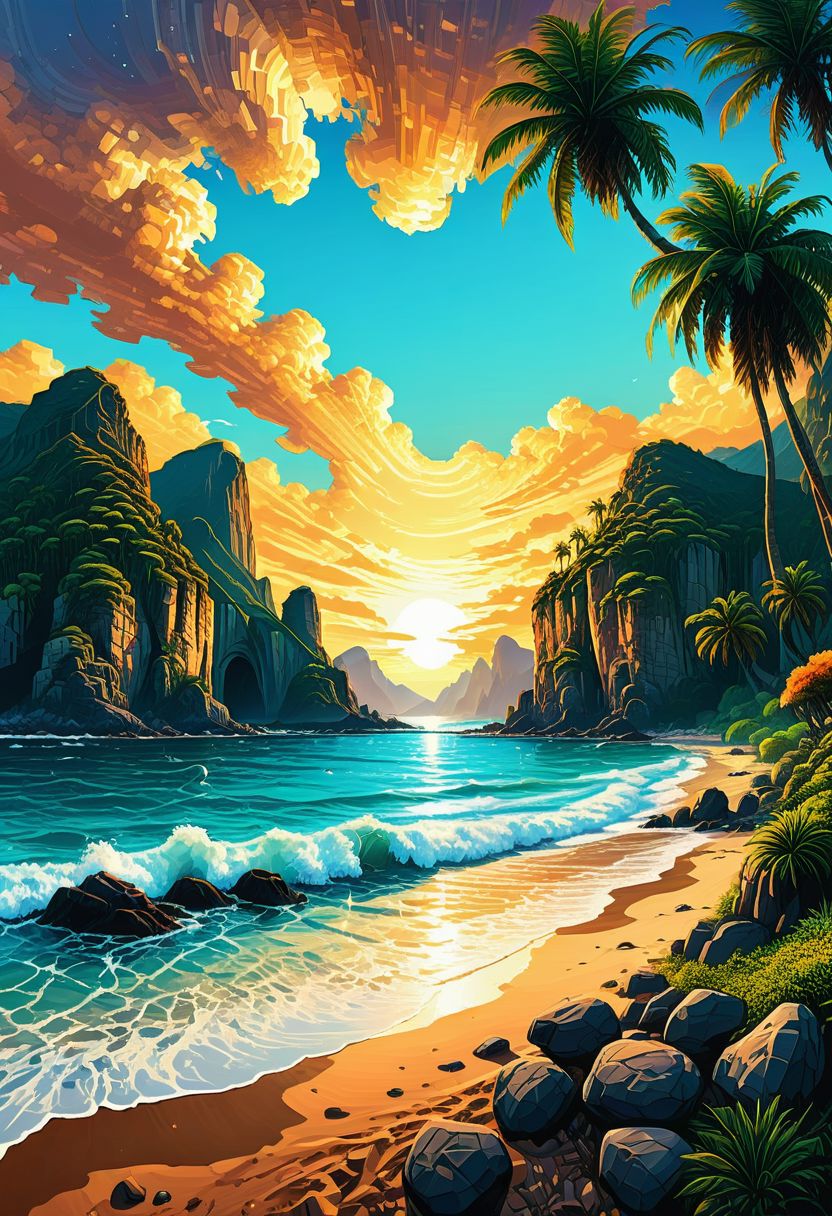 masterpiece,ASCII,8k.absurdes,intricate,maximum resolution, hyper detailed, a beautiful panorama from inside a camper, scenery of a beautiful beach, with palm trees, sunset, mountains, rocks, cliffs,