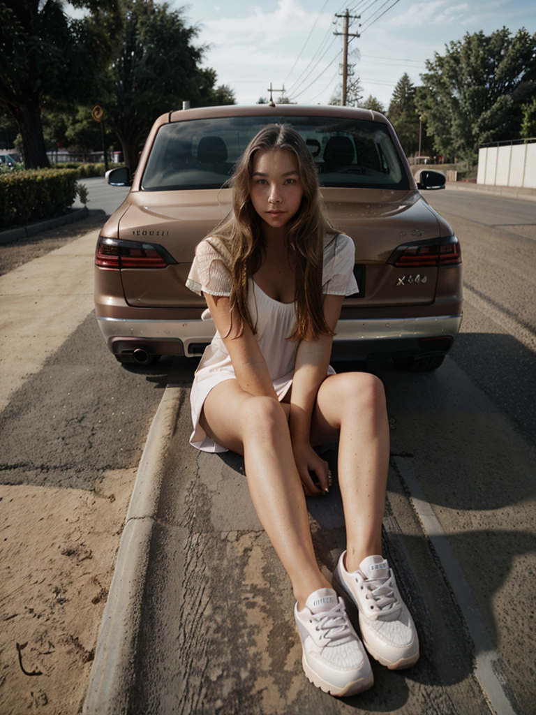 A beautiful 4l3x1sr woman, 1girl,solo,long hair,blonde hair,brown hair,dress,shoes,bag,ground vehicle,sneakers,motor vehicle,realistic,car,soft lighting, professional Photography, Photorealistic, detailed, RAW, analog, sharp focus, 8k, HD, high quality, masterpiece<lora:4l3x1sr:1.0>
