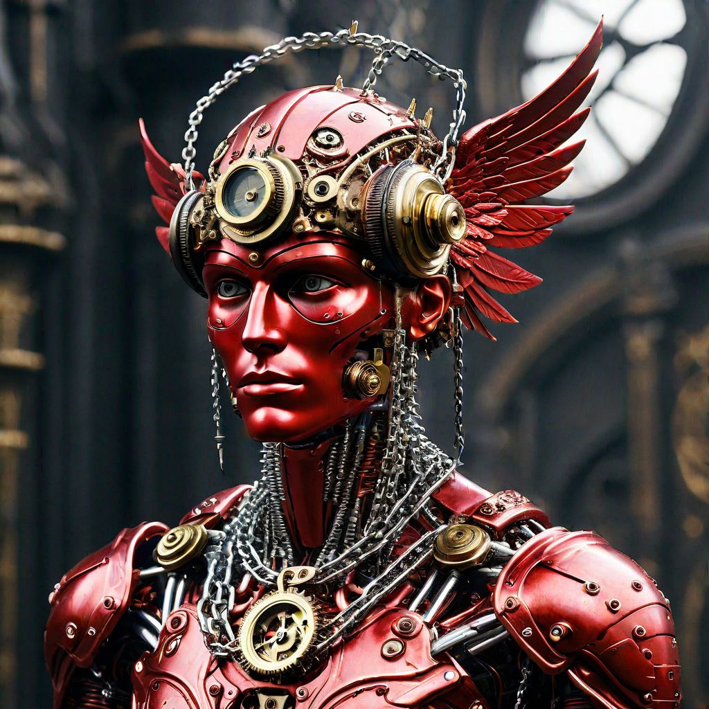 a red metallic helmed clockwork human head centaur with wings and spiked chains instead the arms