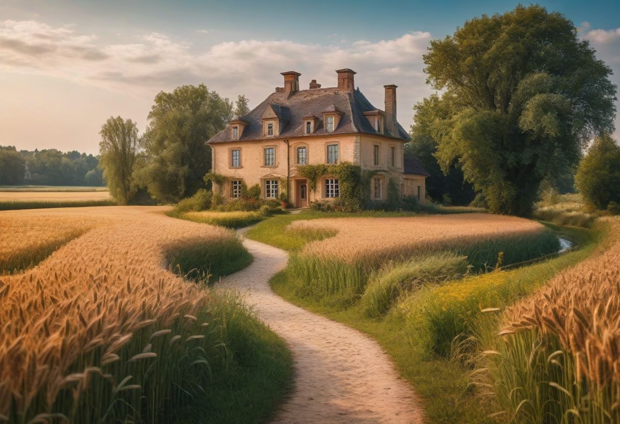 a winding path to a beautiful country house in the middle of a wheat field, trees, flowers, river, enchanted fairytale landscape, 8k, raw photo, masterpiece, intricate details,