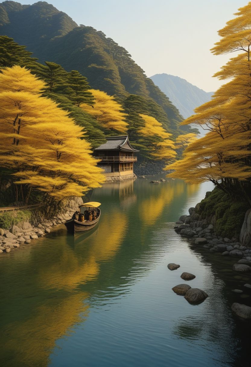 by Hasui Kawase, (golden but extremely beautiful:1.4), (intricate details, masterpiece, best quality:1.4), looking at viewer, wide angle view, <lora:add-detail-xl:1> in the style of nicola samori