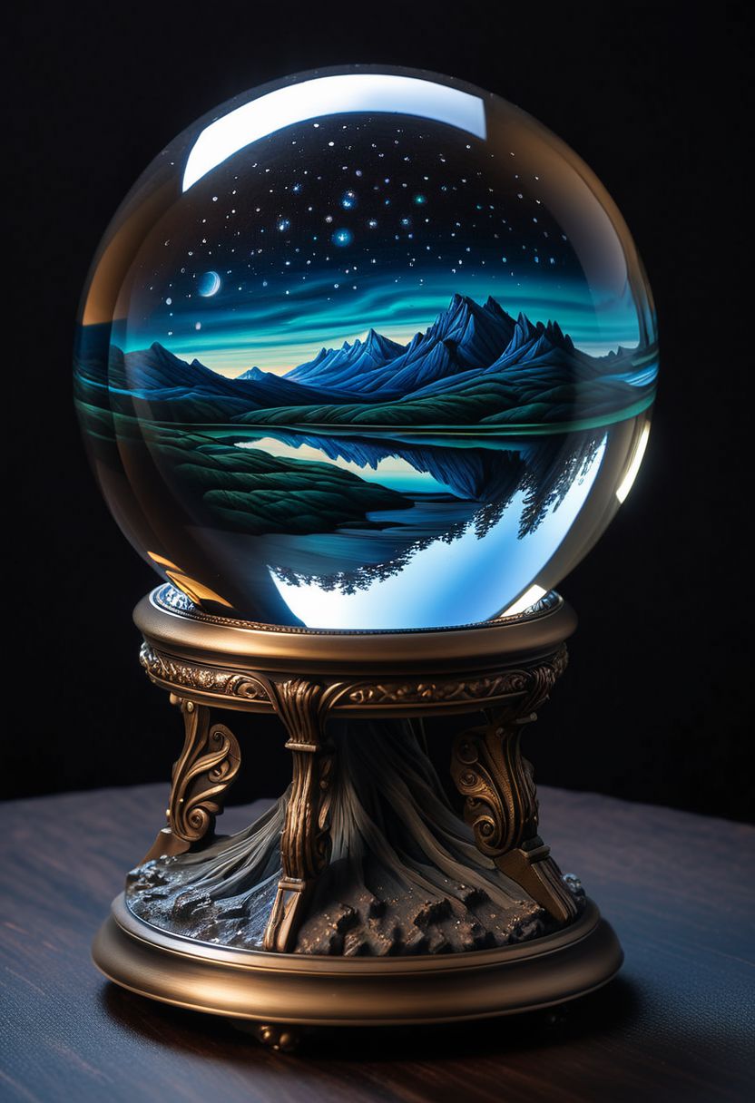 Mythical Nightscape, ((masterpiece, high quality, best quality, 8k, wallpaper, fine lineart, highly detailed)), magical style land art style hyperrealistic, vivid colors, intricate details, realistic style, oil paintings, acrylic paintings, watercolor paintings, digital illustrations, mixed media pieces, sculptures casting shadows,( lunar:0.7), dark cosmic sky, photorealistic, extreme detail,lifelike,crisp,precise, (astronomy photo:0.8),( crystal ball:1.5), in a dark room