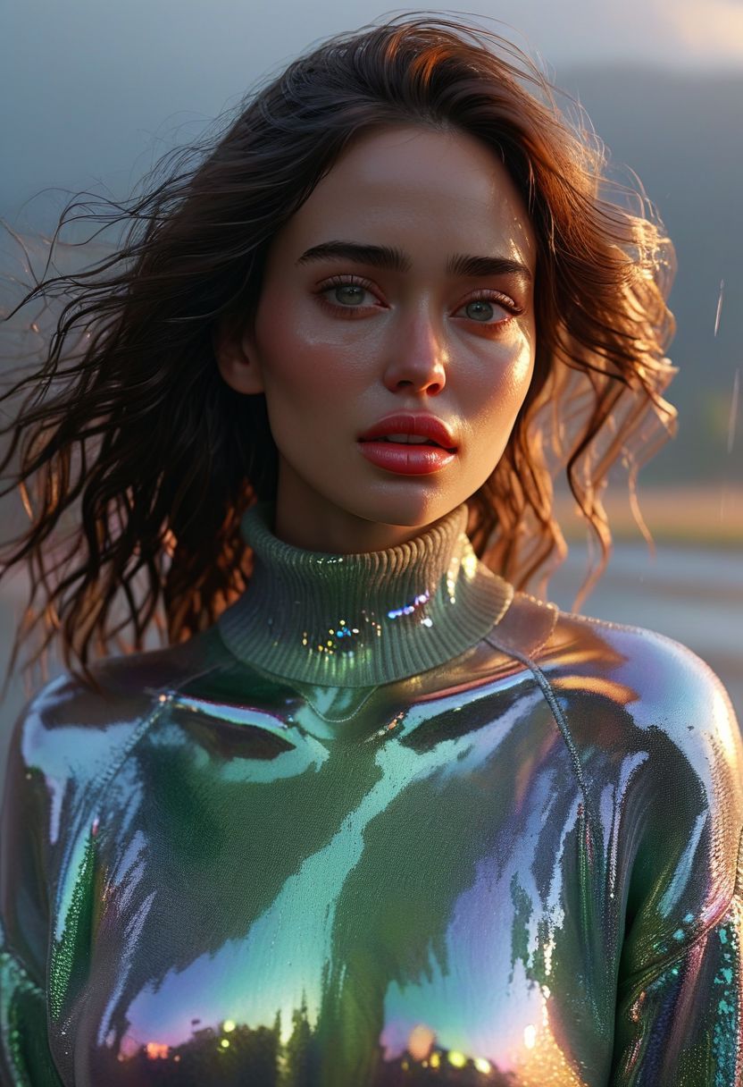 Style: "photo-realistic photo-realism". Type of shot: "extreme close-up upper-half body", "dynamic pose", "head just turned","moving hair","rule of thirds" portrait. Subject: "35yo woman wearing only an oversized iridescent sweater". Action: "staring at the viewer with quite surprised and a bit happy expression and sensually parted lips, happy natural pose, crying, wiping her tears with sleeve". Aesthetic: " Rainy night". Illumination: "Extremely dark". Season: "Spring". Look: "iridescent hair ", "iridescent choker", "iridescent outfit". Background: "countryside night, stormy, birds flying". Makeup: "aesthetic makeup","big, lips","iridescent lipstick","big natural saggy breasts". Body: "extremely realistic skin","extremely detailed, sweaty skin". Outfit: "extremely Intricate outfit, several glowing body accessories". Life-like details. Cinematic. Dramatic. Dynamic. Extremely refined lines and and shapes. Extremely refined details on objects. Sharp details. Wide range of colors. Many details everywhere. Ray-Tracing. Anti-Aliasing. Realistic soft shadows. Low saturation colors. Insane quality. Insane resolution. Insane details. Masterpiece. 32k resolution.