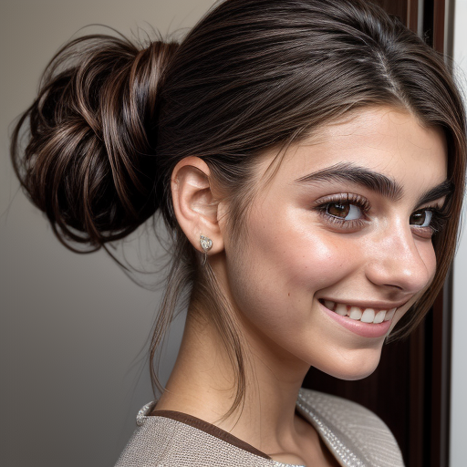 (21 y.o.:1.1) Chaya_Single in a dress, closeup photo, detailed (brown eyes:1.2), smile <lora:LowRA:.3>, hair up in a ponytail
