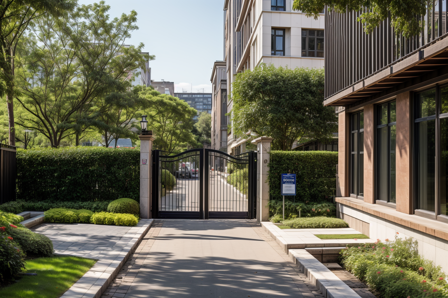 <lora:JJsLandscapeDesign_V2:.5>,masterpiece, best quality,Landscape, scenery, outdoors, building, tree, sky, real world location, grass, bush, flower, city, swimming pool, lawn, sidewalk, ivy, bench,sakura, dawn, pond,day, column, beam,building facade, RAW photo, subject, 8k uhd, dslr, soft lighting, high quality, film grain, Fujifilm XT3 ,car entrance, gate, water spray,