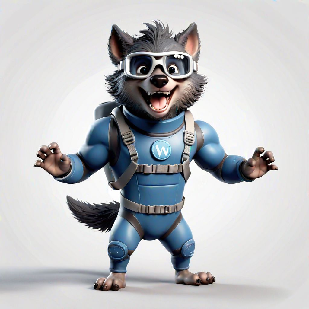Cute and adorable baby werewolf with full body, oxygen tank and goggles, excited and happy expression, wearing wetsuit on body, expresses various movements, 2d cute, happy, fantastic, dreamy, illustration, 3d three-dimensional, centered, professional no see. Soft, modern and cool. It has graphics, line art, and a white background.