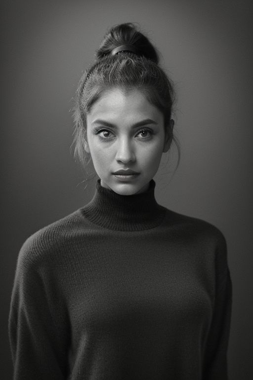 upper body, madhubala , monochrome, portrait, 2000's hairdo, headshot, ponytail, ((cleavage)), flirty, parted lips, (looking at viewer) , ,Fine art photography style,