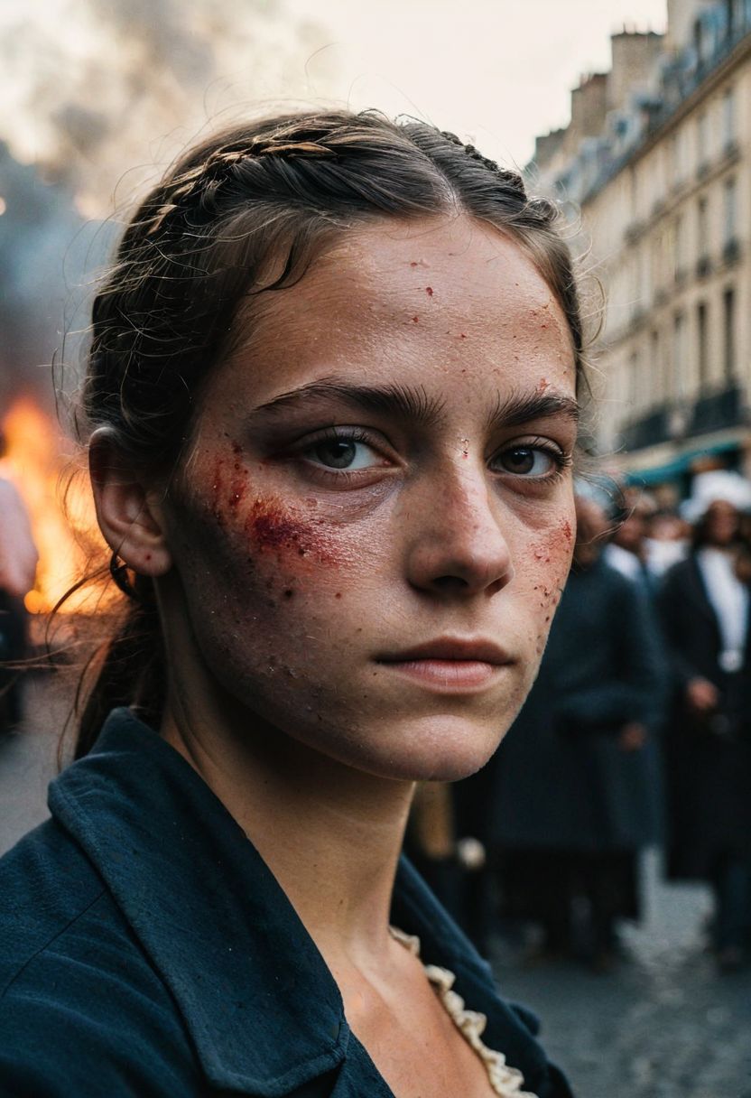close-up shot of an 18-year-old French woman called Libert standing in the streets of Paris during the French Revolution of 1830 looking over her shoulder directly at the camera, natural skin texture, realistic skin texture, (skin pores:0.8), (skin oils:0.6), chaos, street barricades, (fire, smoke:1.4), cinematic look, breathtaking photograph, award winning photograph, dramatic lighting, highly detailed, 35mm photograph, 4k, vivid colors, shot on hasselblad, split lighting, fFaceDetail