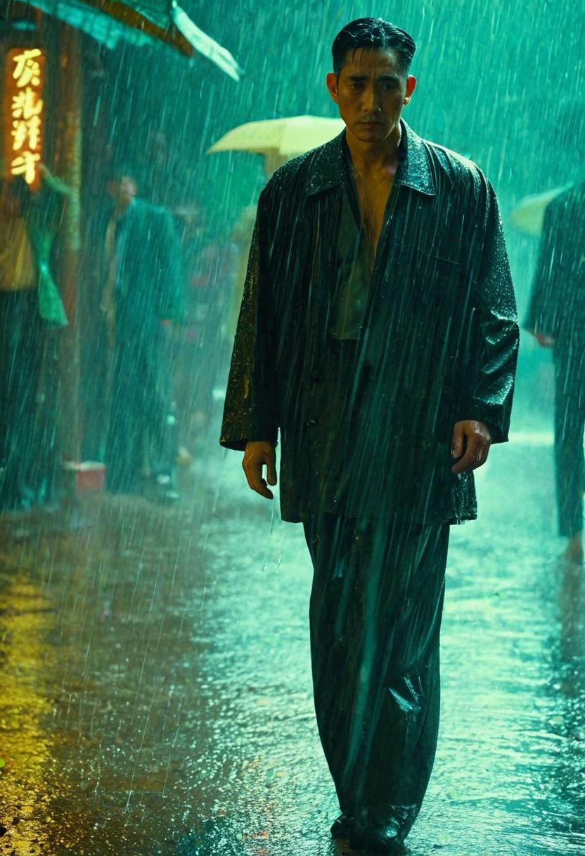 The texture of a Wong Kar Wai movie, a strong man standing in the rain, making fighting movements, the texture of a movie, Ultra High Definition, 4K, Outstanding, Detailed