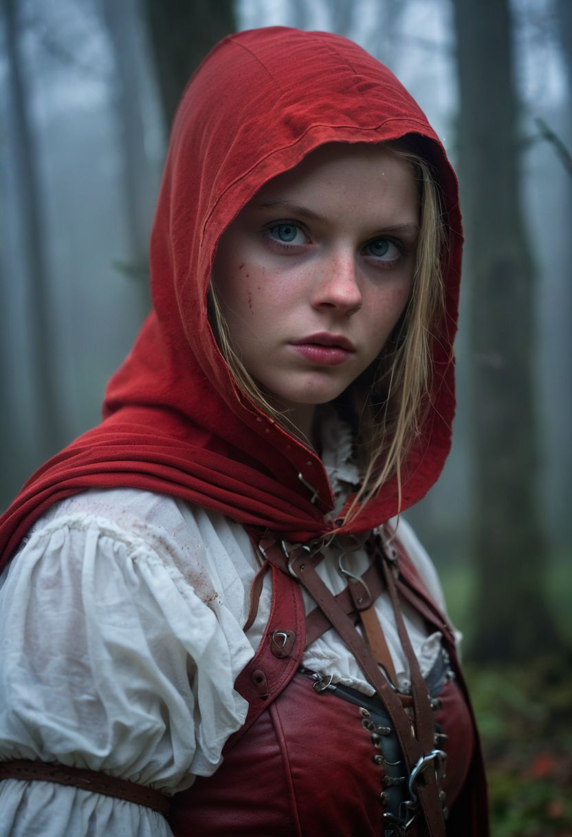 Close Up shot of the Red Riding Good as a little warrior, she IS a very young girl, blond braids hairstyle, beautiful, red hood cape, dirt white dress, leather armour, wind, at night, fog, mist, forest at the background, National Geographic photography awarded masterpiece